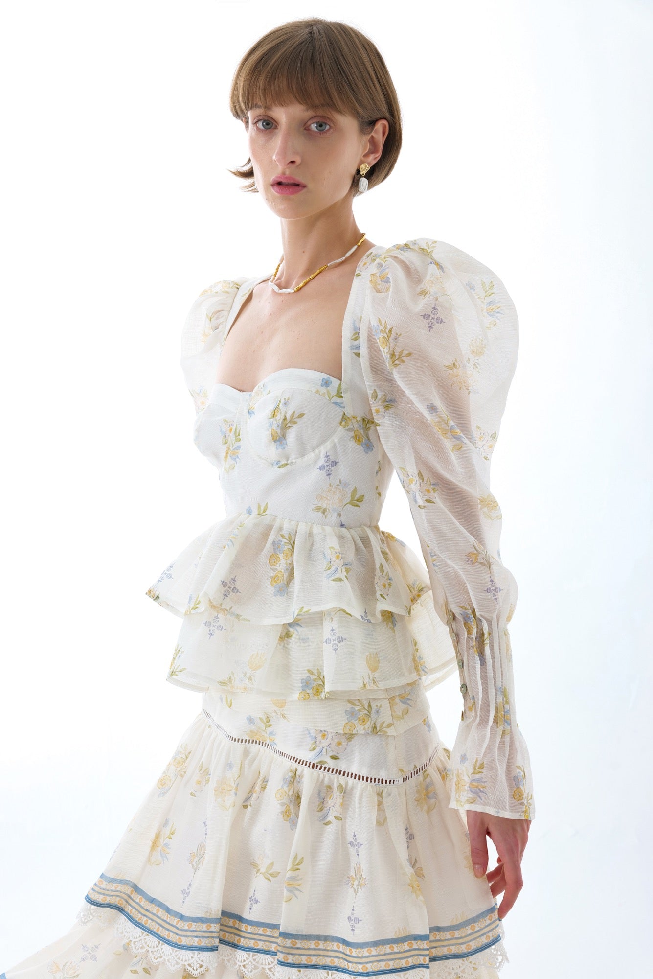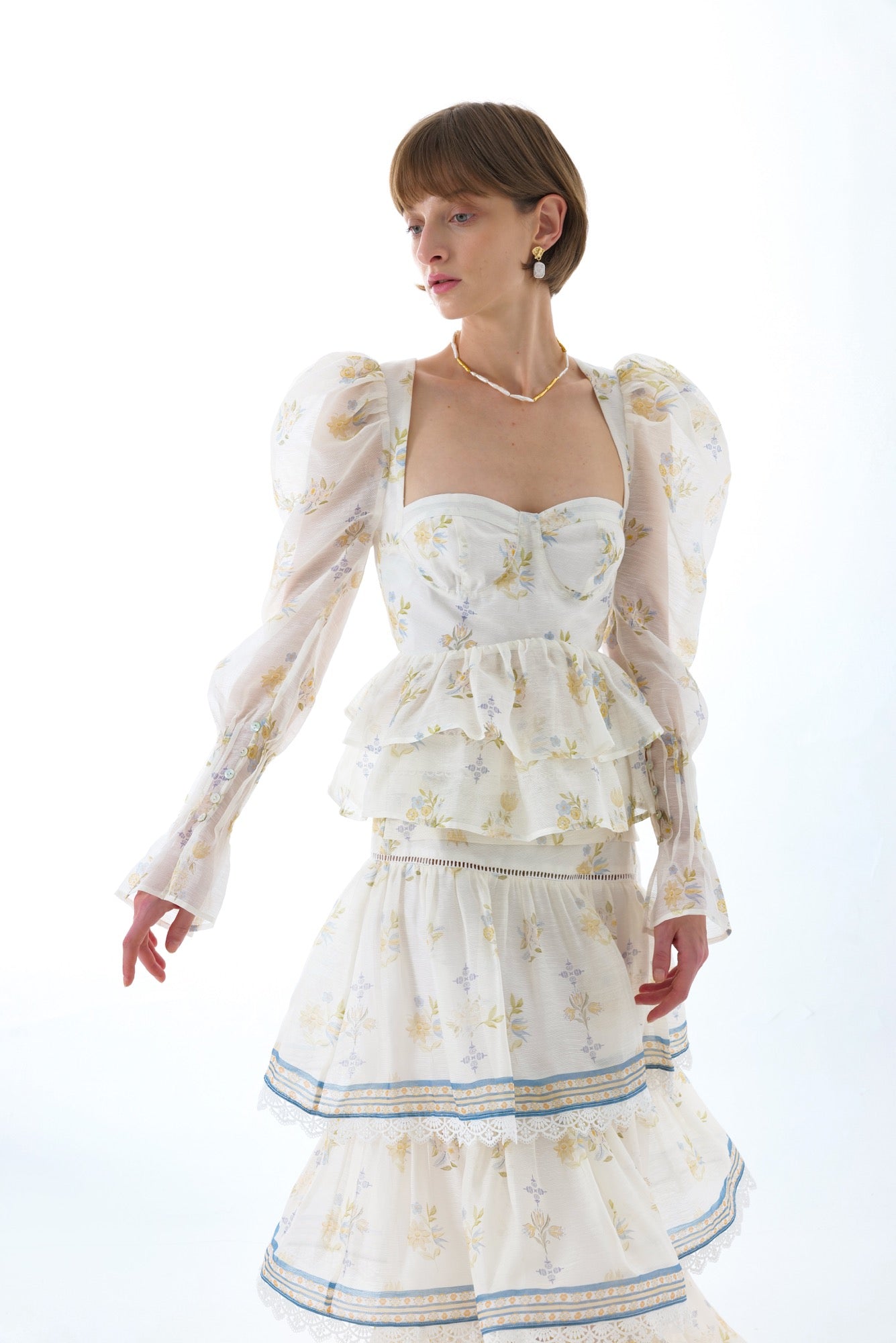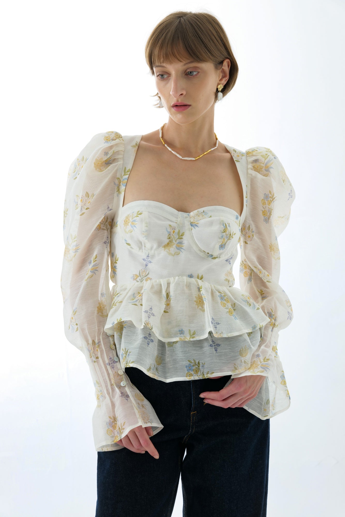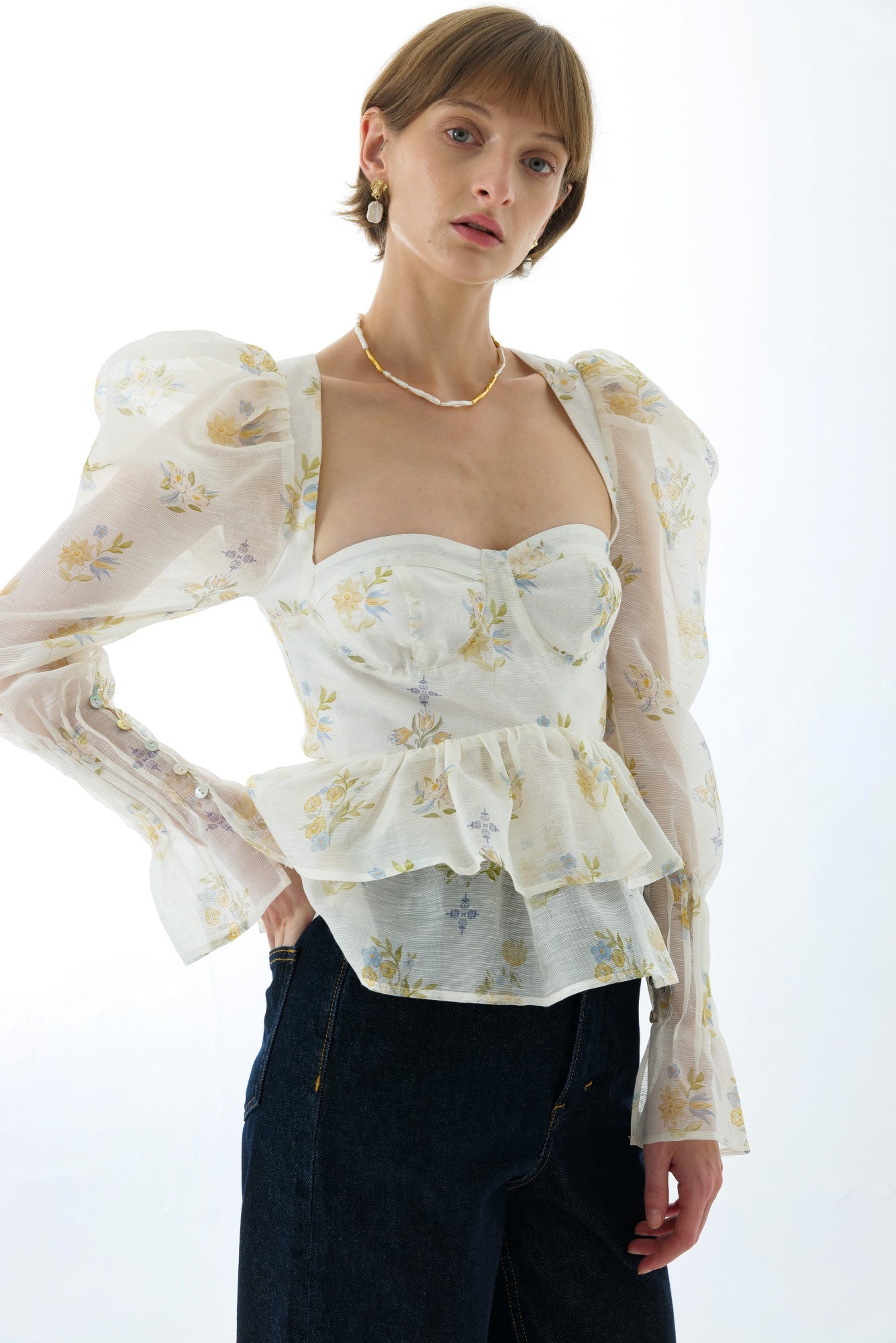 A romantic silk-linen peplum top featuring long puff sleeves, soft bust cups, and delicate frill detailing for a feminine, sculpted silhouette.