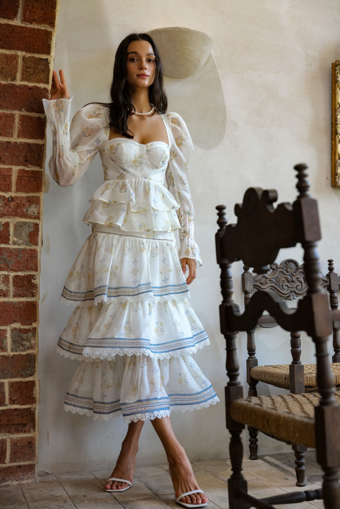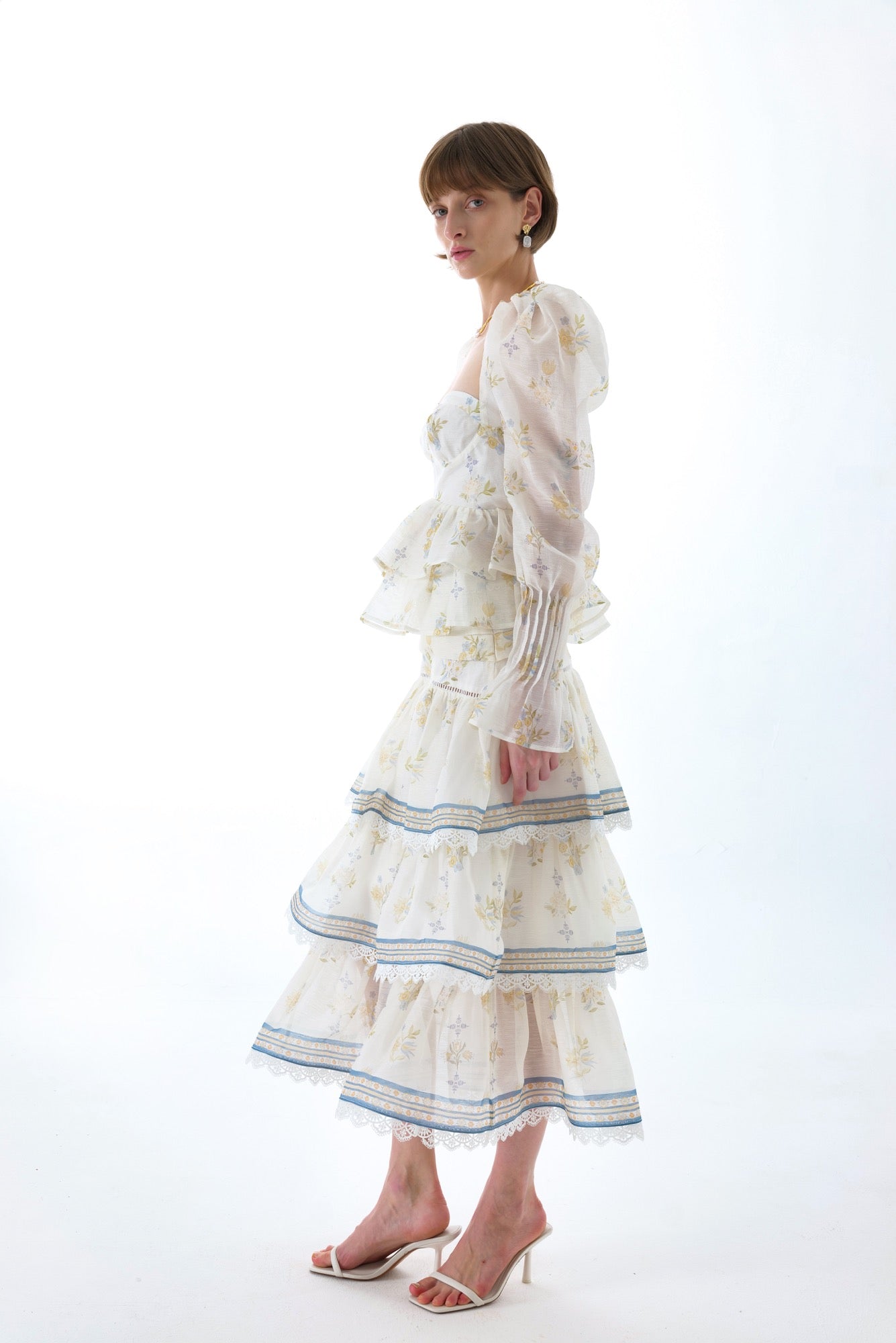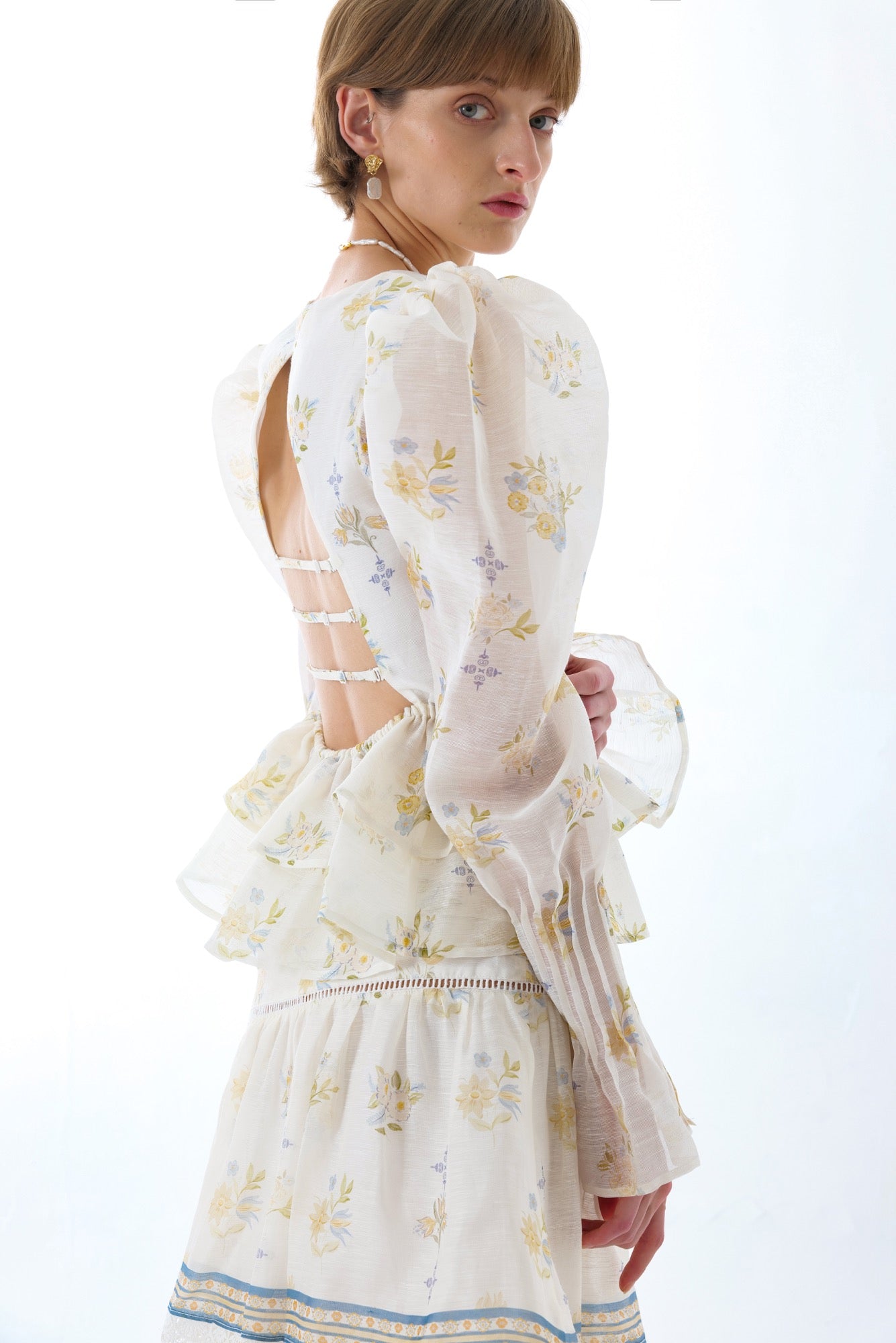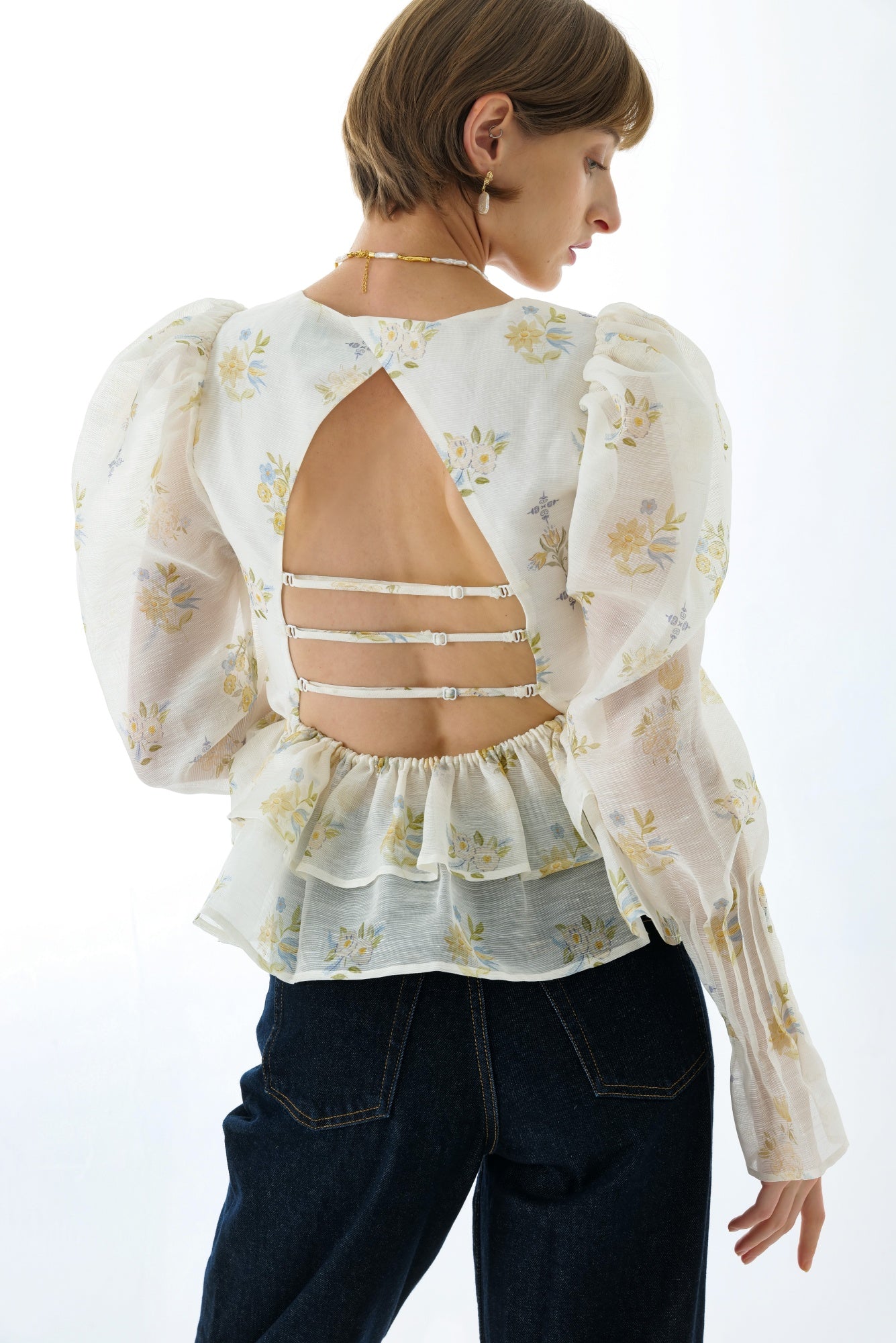 A romantic silk-linen peplum top featuring long puff sleeves, soft bust cups, and delicate frill detailing for a feminine, sculpted silhouette.