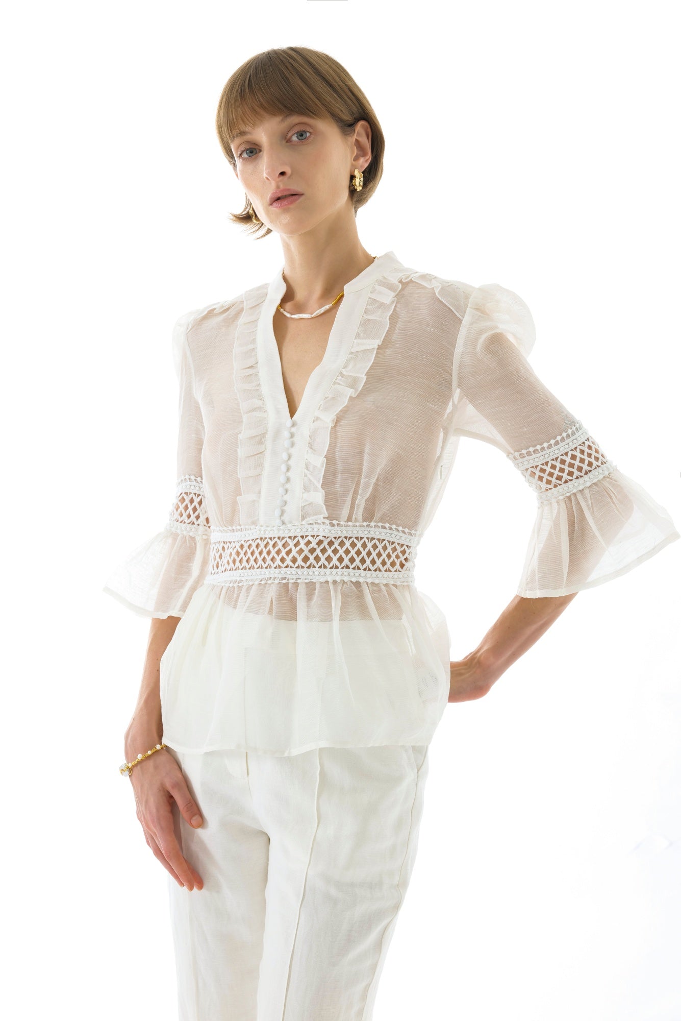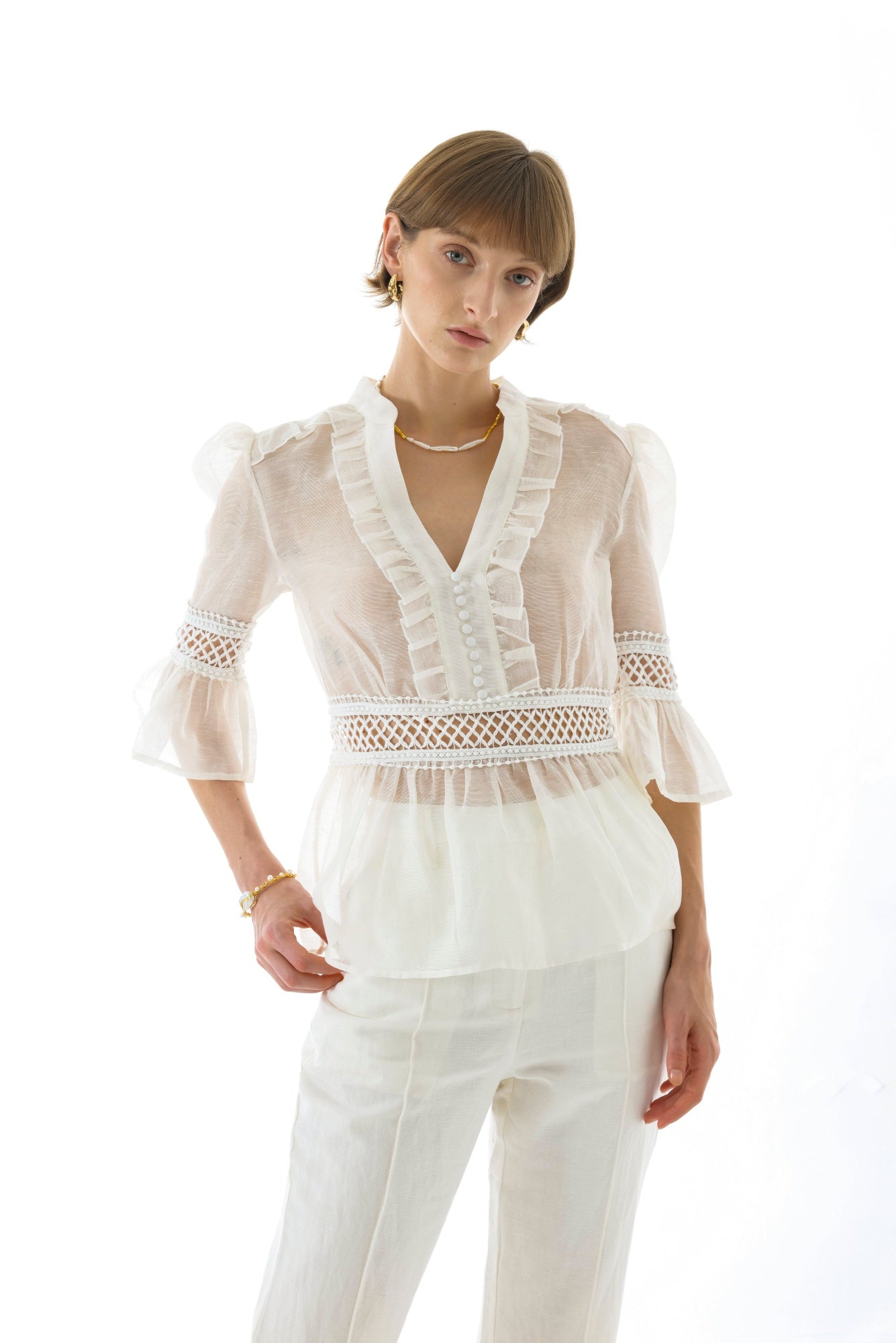 A silk-linen peplum blouse featuring 3/4 length sleeves and delicate crochet trim details, blending structure with soft, feminine charm. Pair back with our Josephine Belt Pants.