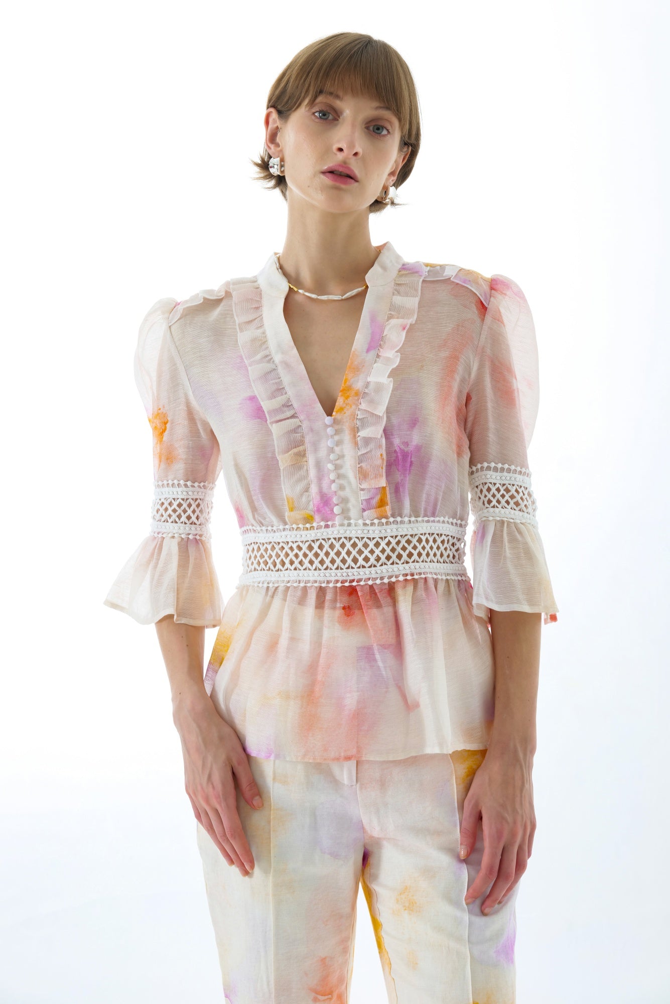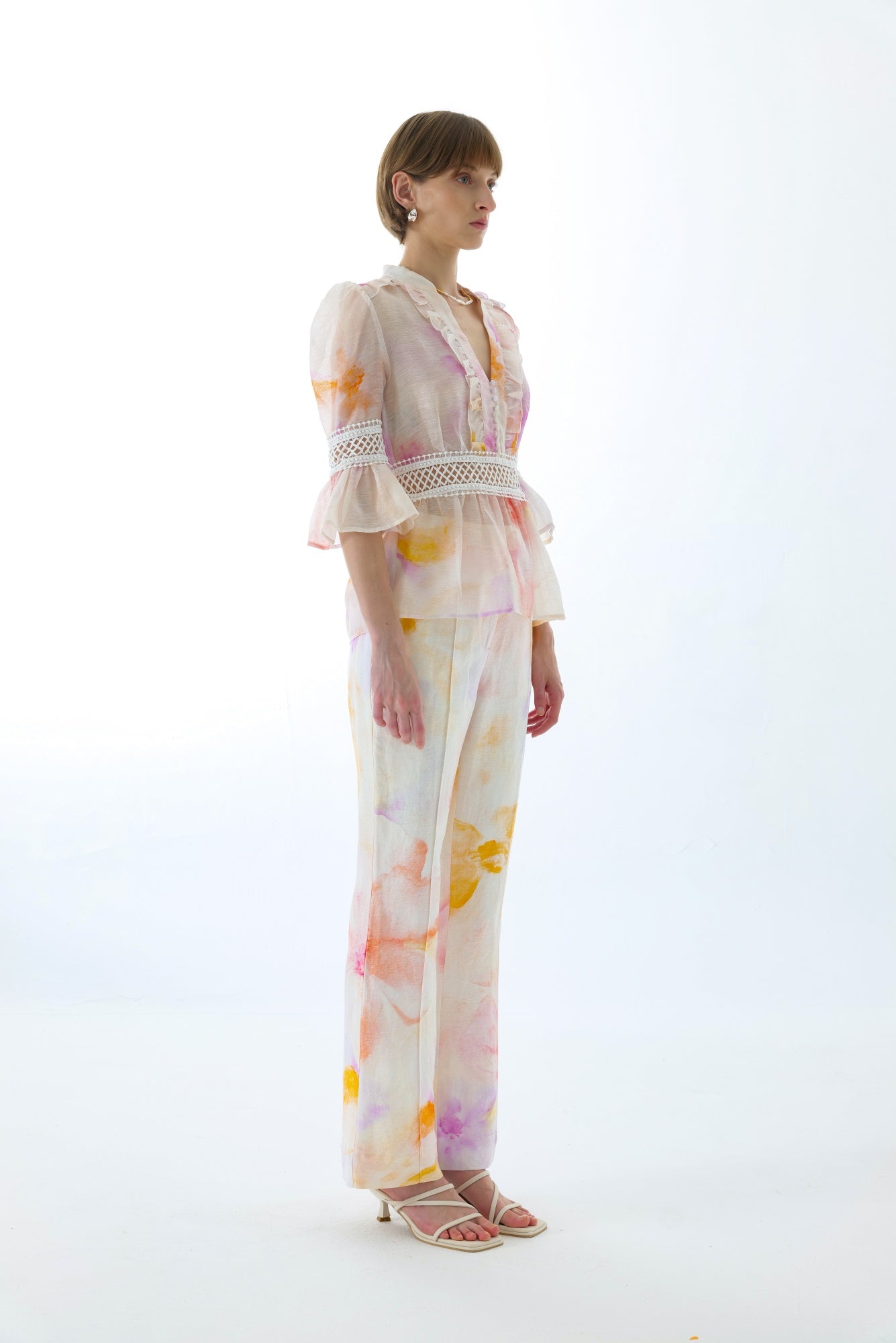 A silk-linen peplum blouse featuring 3/4 length sleeves and delicate crochet trim details, blending structure with soft, feminine charm. Pair back with our Josephine Belt Pants.
