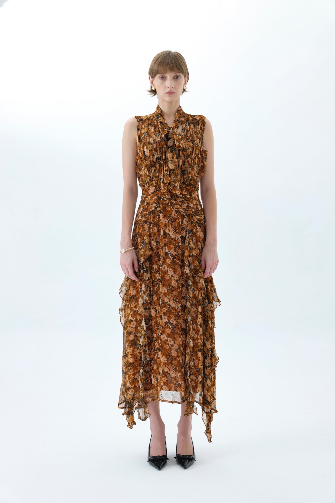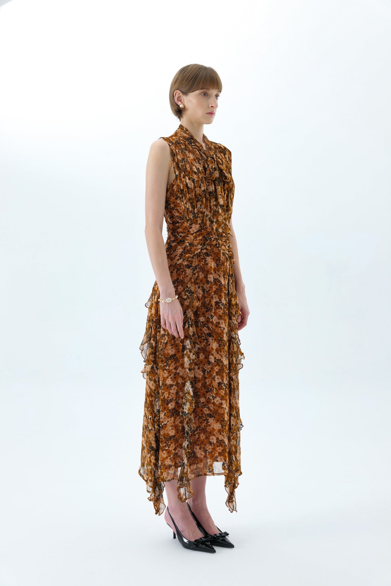 A signature Kindred style - A sleeveless maxi dress in a burnt floral print, featuring soft waterfall frill detailing and a delicate tie-neck for a flowing, feminine silhouette.