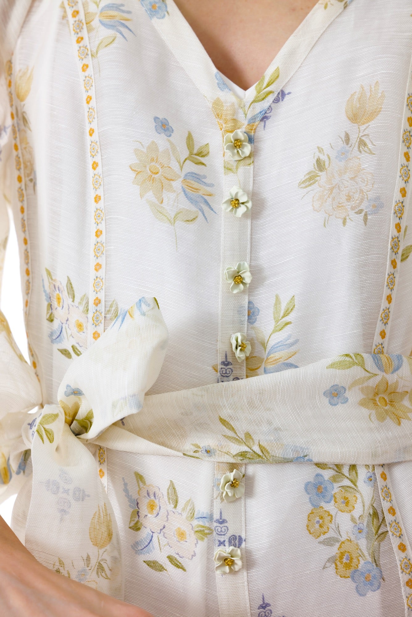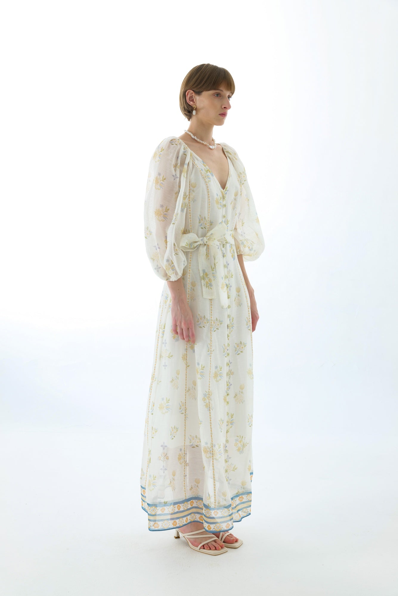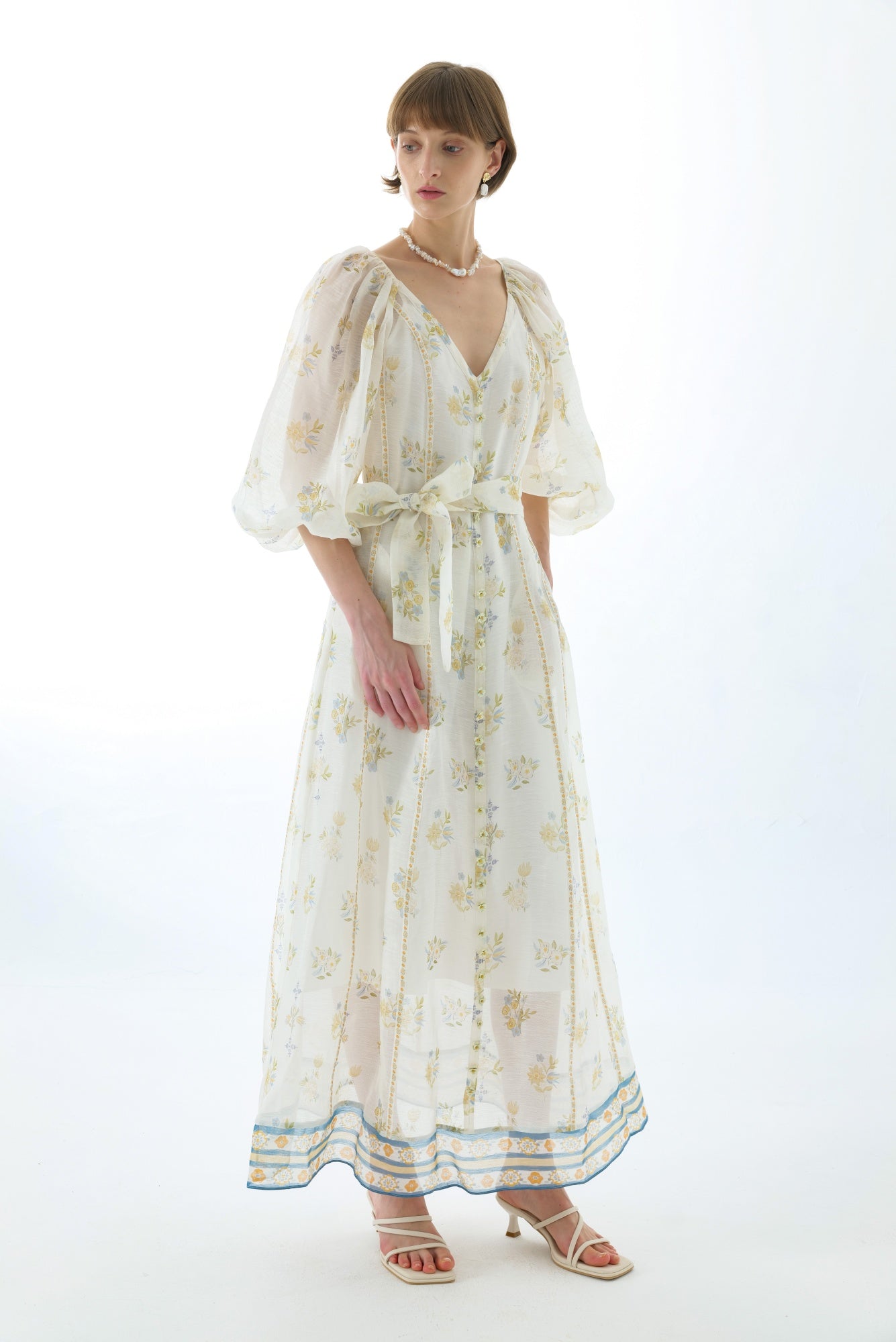 A signature Kindred style – a romantic puff-sleeve maxi dress crafted from a luxurious linen-silk blend, featuring a flowing silhouette and a delicate placement border print at the hem. Finished with custom metal floral buttons for an elevated, feminine touch.